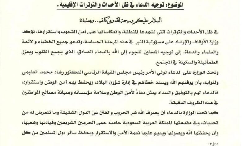 (#وكالة_الأنباء_الحضرمية) الإثنين 9/مارس/2026م وجّه وزير الأوقاف والإرشاد تركي بن عبدالله الوادعي أئمة وخطباء المساجد والدعاة…