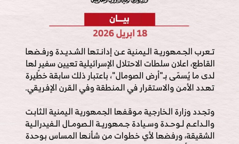 اليمن يدين تعيين سفير إسرائيلي لدى ما يُسمى بـ”أرض الصومال” ويؤكد رفضه القاطع
