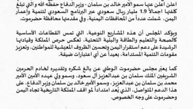 مجلس حضرموت الوطني يشيد بالمشاريع التنموية السعودية ويؤكد دورها في دعم استقرار اليمن