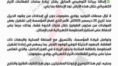 كهرباء وادي حضرموت توضح أسباب زيادة انقطاعات التيار وتؤكد نفاد وقود الديزل منذ 25 ديسمبر