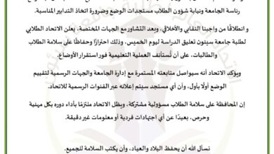 (#وكالة_الأنباء_الحضرمية) الأربعاء 3/ديسمبر/2025م أعلن الاتحاد العام لطلبة جامعة سيئون تعليق الدراسة ليوم غدٍ الخميس، في بيان رسمي صدر قبل قليل،…