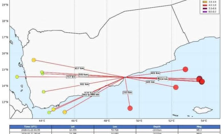 وأوضح المركز أن هذه الهزات تقع على بعد نحو 400 كيلومتر عن مدينة المكلا، مؤكداً أنها لا تشكل أي تهديد على المناطق الساحلية أو السكان، وأن المركز مستمر في مراقبة النشاط الزلزالي، داعيًا المواطنين إلى متابعة المعلومات من المصادر الرسمية وعدم الانسياق وراء الشائعات.