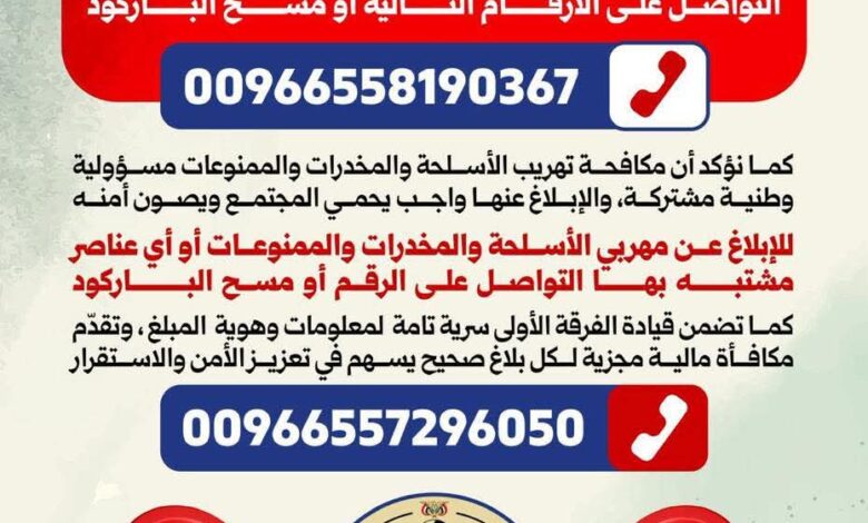 قوات الطوارئ اليمنية – الفرقة الأولى تدعو للإبلاغ عن المخالفات وتؤكد منع أي تحصيلات أو تجاوزات غير قانونية