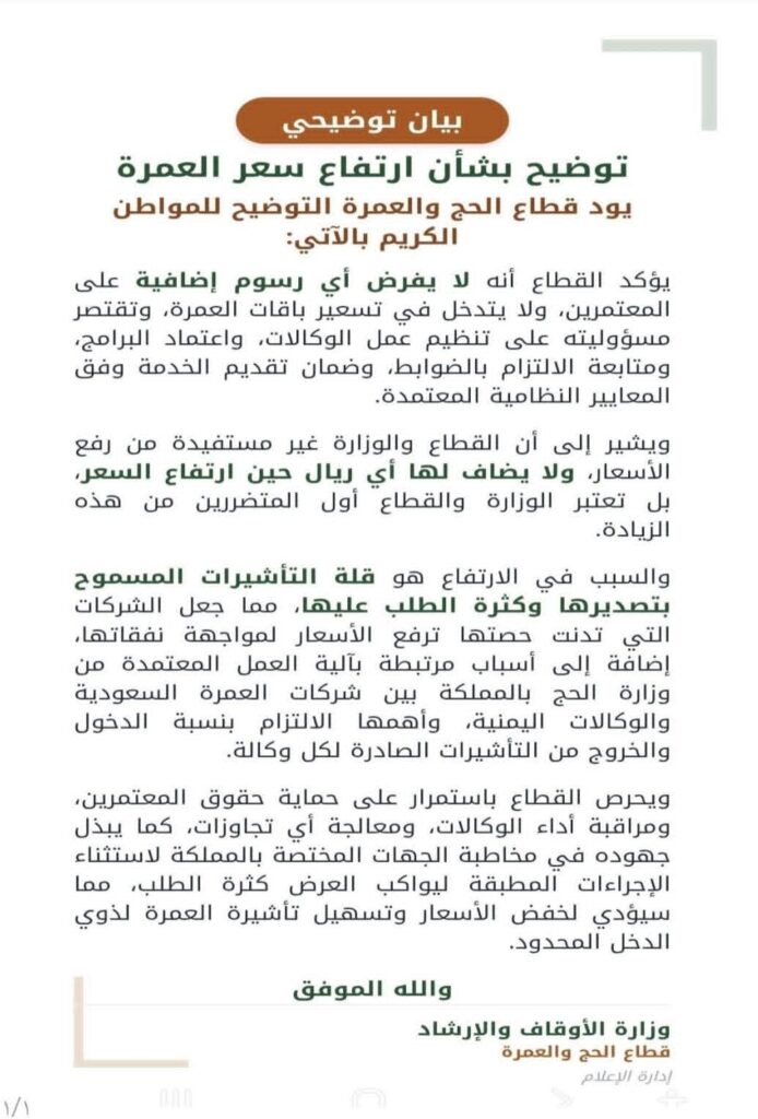 وأوضح القطاع في بيان رسمي أن تفاوت أسعار باقات العمرة بين الوكالات ناتج عن التكاليف التشغيلية التي تتحملها بعض الشركات في ظل قلة التأشيرات، مؤكدًا أن دور الوزارة يقتصر على تنظيم عمل وكالات العمرة واعتماد برامجها ومتابعة التزامها بالضوابط القانونية دون التدخل في تسعير الخدمات.