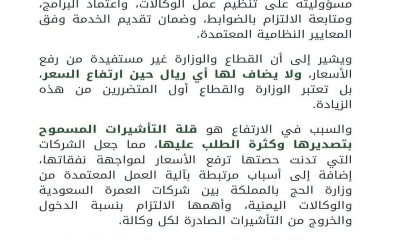 وأشار البيان إلى أن أي ارتفاع غير مبرر في الأسعار ينعكس سلبًا على القطاع والوكالات النظامية على حد سواء، لافتًا إلى أن هناك اعتبارات تنظيمية أخرى مرتبطة بالآلية المعتمدة من وزارة الحج والعمرة بالمملكة العربية السعودية، ومنها الالتزام بنسبة الدخول والخروج المقررة لكل وكالة.