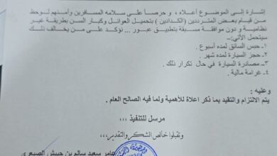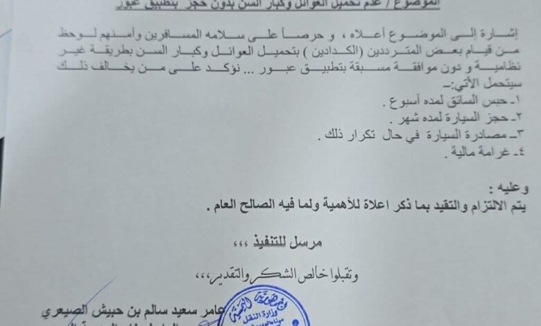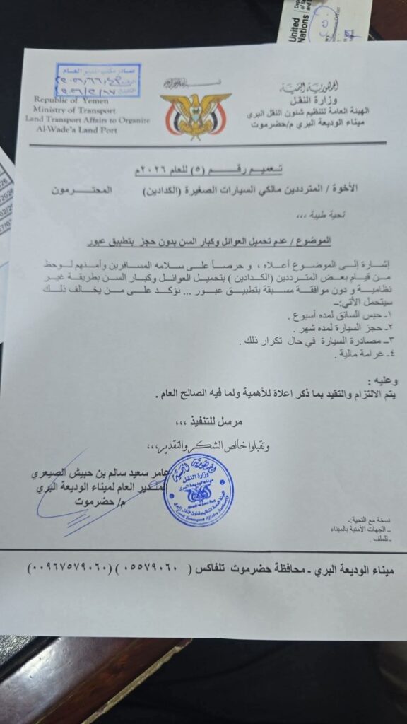 وأكد التعميم، الصادر عن إدارة ميناء الوديعة البري، أن رصد مخالفات متكررة من قبل بعض السائقين بتحميل الركاب من العوائل وكبار السن بطريقة غير نظامية ودون موافقة مسبقة، يُعد مخالفة صريحة للتعليمات المعتمدة، ويعرّض سلامة المسافرين للخطر.