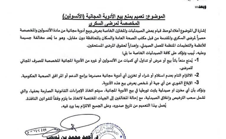 تعميم من صحة ساحل حضرموت يمنع بيع الأنسولين والأدوية المجانية ويؤكد معاقبة المخالفين