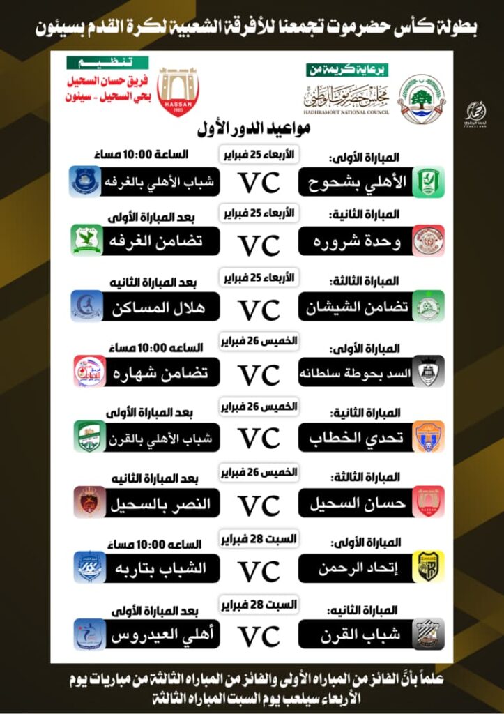 واحتضنت منشآت نادي اتحاد حضرموت انطلاق بطولة كرة القدم للفرق الشعبية، التي ينظمها فريق حسان السحيل، بمشاركة عدد من فرق مديرية سيئون، في أجواء تنافسية تعكس الحراك الرياضي المتنامي خلال الشهر الفضيل.