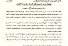 وأوضح الوزير، في تعميم موجّه إلى المنابر الدينية، أهمية الدور الذي تضطلع به المساجد في ترسيخ قيم الطمأنينة والسكينة في المجتمع، وتعزيز روح التضامن والتكاتف بين أبناء الوطن، مؤكدًا أن المنبر الديني يمثل مساحة مهمة لنشر الوعي والدعاء لما فيه خير البلاد والعباد.