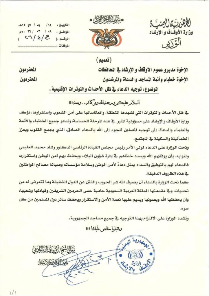 وجّه وزير الأوقاف والإرشاد تركي بن عبدالله الوادعي أئمة وخطباء المساجد والدعاة والمرشدين في مختلف محافظات الجمهورية إلى الإكثار من الدعاء والابتهال إلى الله، في ظل ما تشهده المنطقة من توترات وتطورات إقليمية وانعكاساتها المحتملة على أمن واستقرار الشعوب.