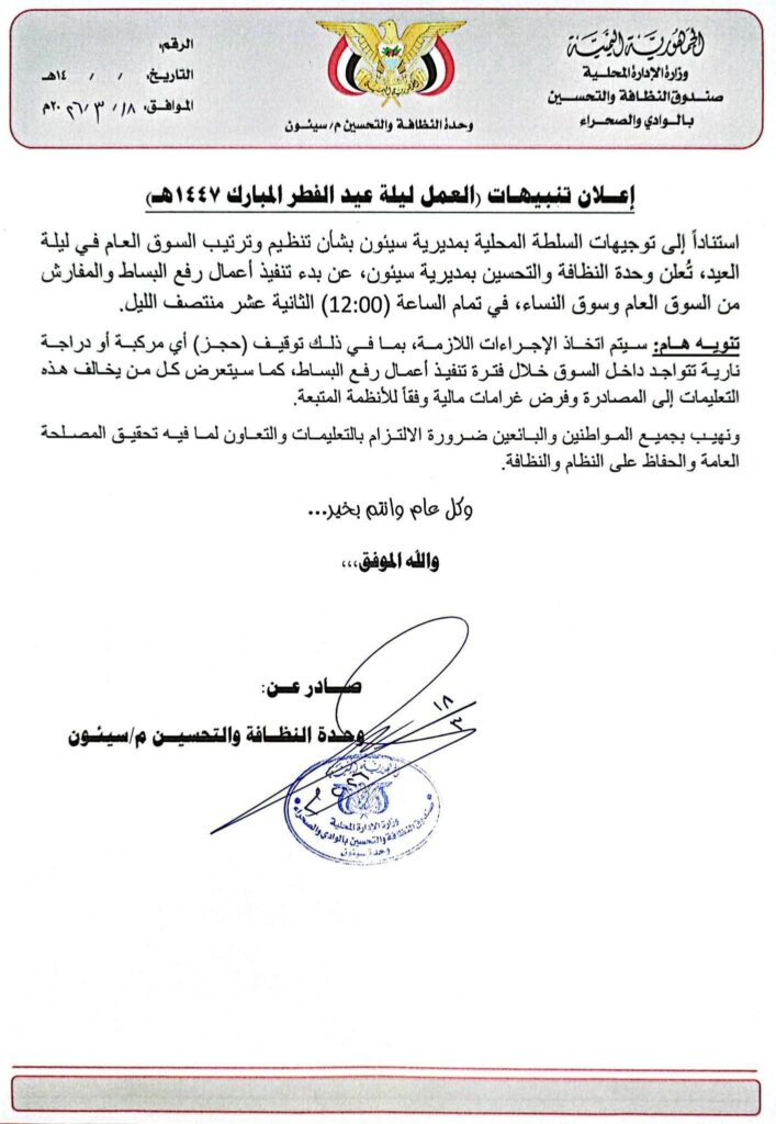 أعلنت وحدة النظافة والتحسين بمديرية سيئون عن بدء تنفيذ حملة تنظيم شاملة للسوق العام وسوق النساء، وذلك ضمن الترتيبات الخاصة بليلة عيد الفطر المبارك 1447هـ، وبناءً على توجيهات السلطة المحلية بالمديرية.