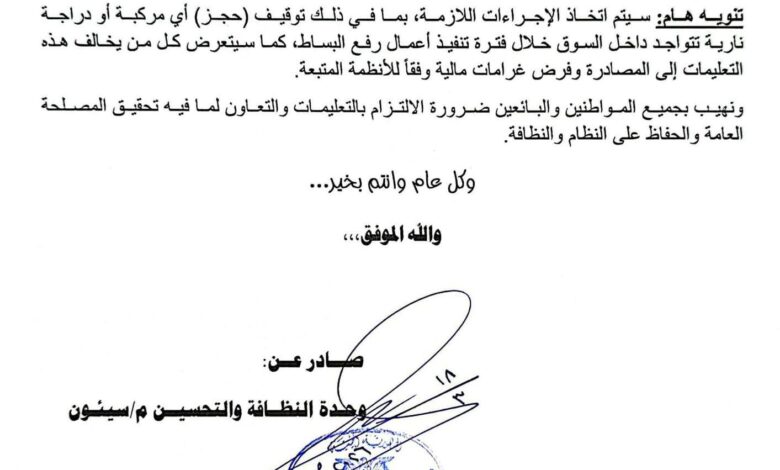 وأكدت أنه سيتم اتخاذ إجراءات صارمة بحق المخالفين، تشمل حجز المركبات والدراجات النارية المتواجدة داخل السوق أثناء تنفيذ الحملة، إضافة إلى مصادرة المخالفات وفرض غرامات مالية وفق الأنظمة المعمول بها.