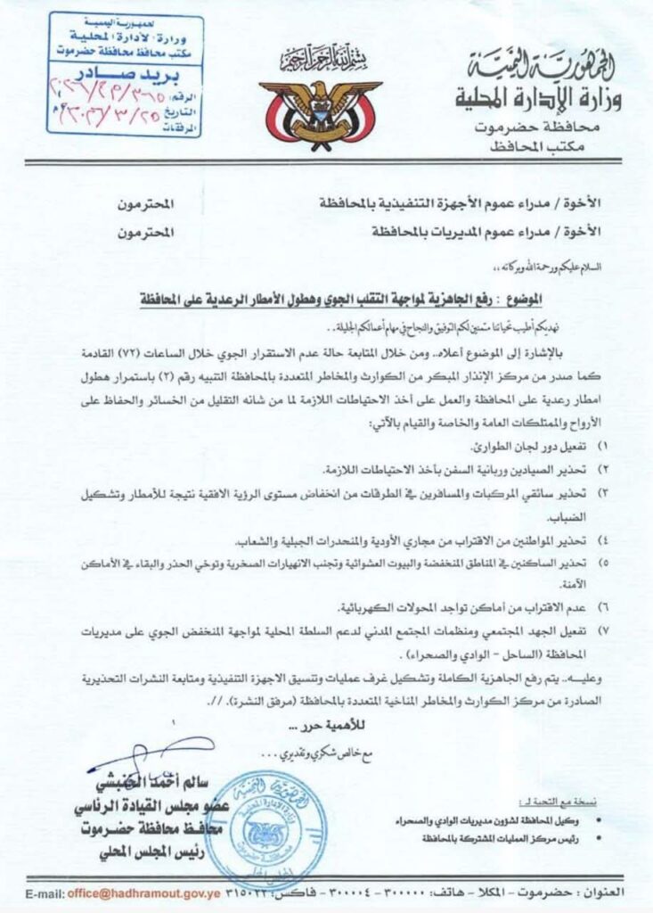 أصدر عضو مجلس القيادة الرئاسي محافظ حضرموت سالم أحمد الخنبشي تعميمًا عاجلًا لكافة الأجهزة التنفيذية ومديري المديريات، يقضي برفع مستوى الجاهزية لمواجهة التقلبات الجوية والأمطار الرعدية المتوقعة خلال الساعات القادمة.