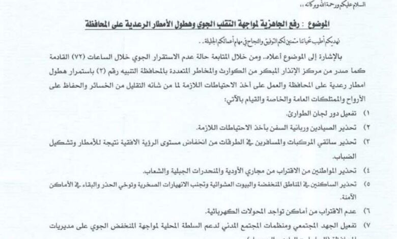 وجاء التعميم استنادًا إلى تحذيرات مركز الإنذار المبكر من الكوارث، حيث شدد المحافظ على ضرورة اتخاذ الإجراءات الاحترازية العاجلة للحد من المخاطر وحماية الأرواح والممتلكات، في ظل توقعات باستمرار حالة عدم الاستقرار الجوي.