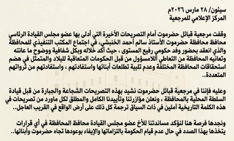 وأكد البيان مساندة المرجعية لأي خطوات أو قرارات تُتخذ لضمان حقوق المحافظة، مشددًا على أهمية تمكين أبناء حضرموت من إدارة مواردهم والاستفادة منها في مختلف القطاعات الخدمية والتنموية.