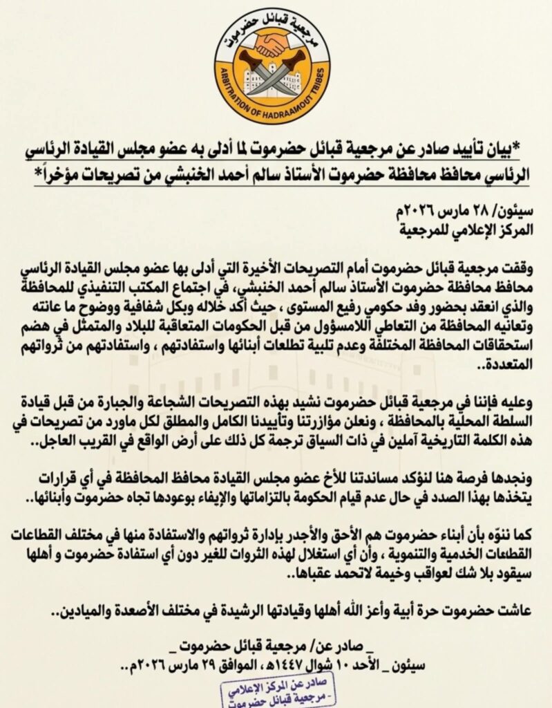 أعلنت مرجعية قبائل حضرموت تأييدها الكامل للتصريحات الأخيرة التي أدلى بها عضو مجلس القيادة الرئاسي محافظ محافظة حضرموت سالم أحمد الخنبشي، بشأن أوضاع المحافظة وحقوق أبنائها.