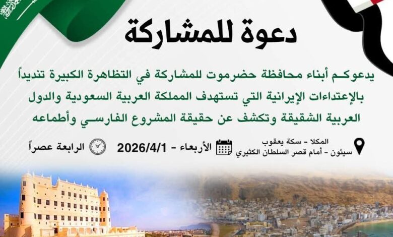 سلطة حضرموت تدعو لاحتشاد شعبي تأييدًا للمملكة وتؤكد وحدة الموقف في مواجهة التهديدات الإقليمية