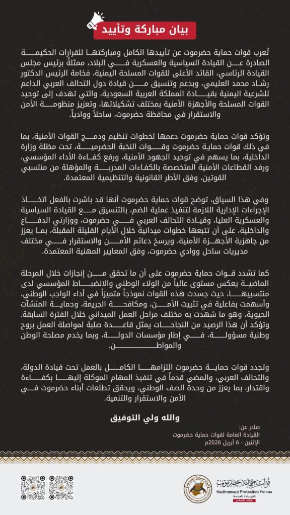 أعلنت قوات حماية حضرموت تأييدها الكامل ومباركتها للقرارات الصادرة عن القيادة السياسية والعسكرية، ممثلةً برئيس مجلس القيادة الرئاسي فخامة الرئيس الدكتور رشاد محمد العليمي، وبالتنسيق مع قيادة التحالف العربي الداعم للشرعية بقيادة المملكة العربية السعودية، والتي تستهدف توحيد القوات المسلحة والأجهزة الأمنية وتعزيز الاستقرار في محافظة حضرموت.