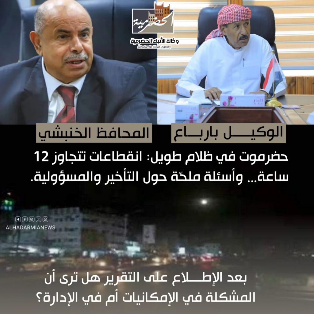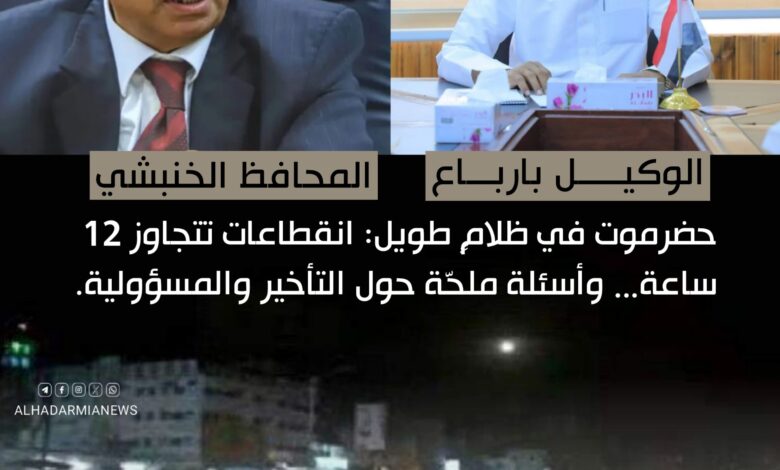 وتحمّل السلطة المحلية بمحافظة حضرموت، ممثلة بالمحافظ سالم الخنبشي ووكيلها جمعان بارباع، المسؤولية الكاملة عن استمرار تدهور خدمة الكهرباء، في ظل غياب المعالجات الفعلية والتأخر في اتخاذ الإجراءات اللازمة لمعالجة الأزمة قبل تفاقمها.