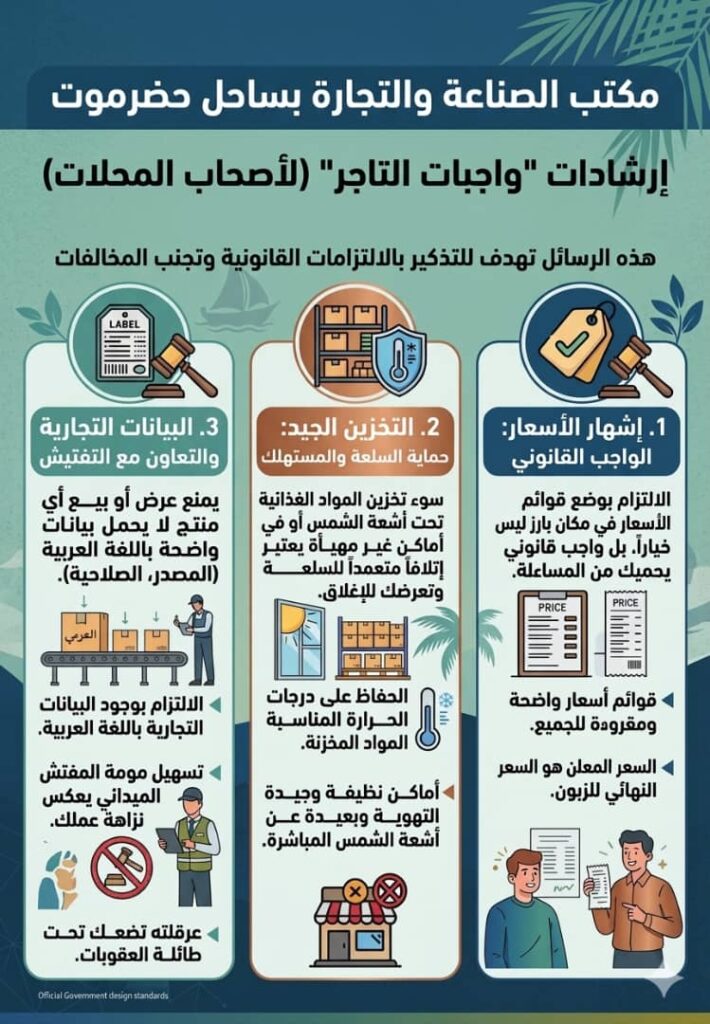 أصدر مكتب الصناعة والتجارة بساحل حضرموت تنبيهاً توعوياً موجهاً لأصحاب المحلات التجارية، دعا فيه إلى ضرورة الالتزام بالضوابط القانونية المنظمة للأسواق، بما يسهم في حماية المستهلك وتعزيز استقرار النشاط التجاري.