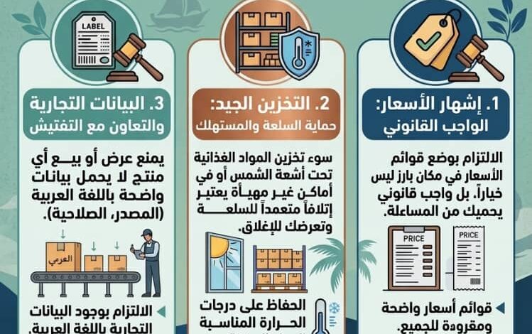 عدم عرض أو بيع أي منتج دون بيانات واضحة باللغة العربية تشمل بلد المنشأ وتاريخ الصلاحية، والتعاون مع فرق التفتيش أثناء النزولات الميدانية.