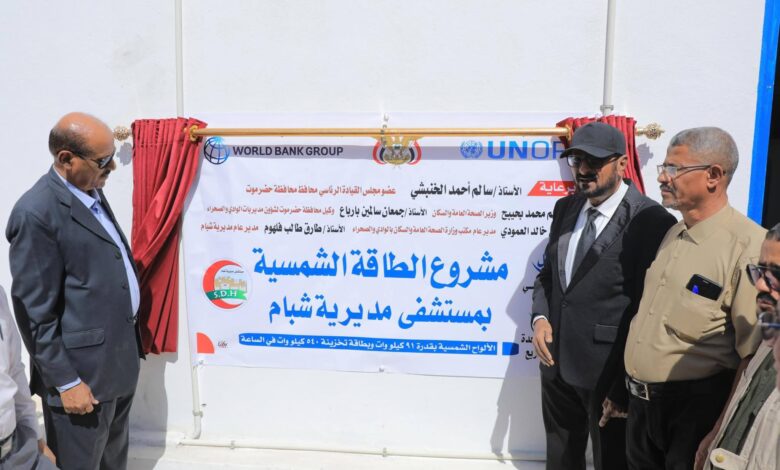 وافتتح الوكيل مشروع الطاقة الشمسية بمستشفى شبام، والذي يتضمن تركيب منظومة بقدرة 91 كيلو وات، وبطاقة تخزينية تصل إلى 540 كيلو وات/ساعة، بتمويل من البنك الدولي وتنفيذ مكتب الأمم المتحدة لخدمات المشاريع (UNOPS)، بما يسهم في استقرار التيار الكهربائي وتحسين جودة الخدمات الطبية المقدمة للمواطنين.