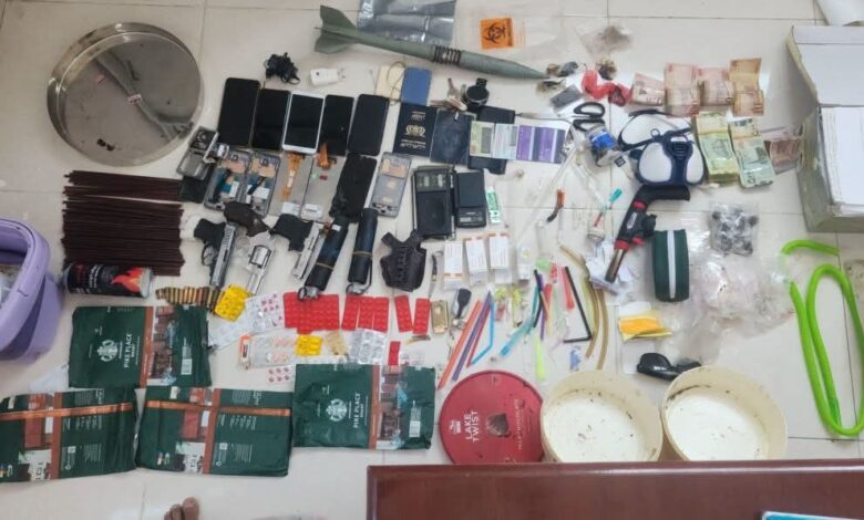 كما ضبطت الأجهزة الأمنية مبالغ مالية بعملات مختلفة، إلى جانب أسلحة نارية متعددة وذخائر، شملت مسدسات وأسلحة أخرى، بالإضافة إلى قنابل صوتية ومواد مرتبطة بالتفجير، وعدد من جوازات السفر.