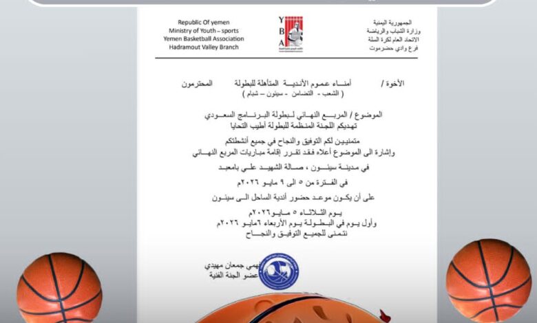 سيئون تستعد لاحتضان نهائيات بطولة حضرموت الثانية لكرة السلة.. 6 مايو انطلاق المربع الذهبي
