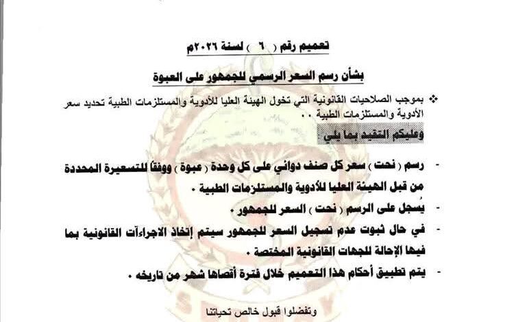 أصدرت الهيئة العليا للأدوية والمستلزمات الطبية تعميمًا رسميًا يقضي بإلزام شركات ومستوردي الأدوية والمستلزمات الطبية بإشهار السعر الرسمي للمستهلك على جميع العبوات الدوائية، وذلك ضمن إجراءات تنظيم السوق الدوائي وحماية المستهلك.