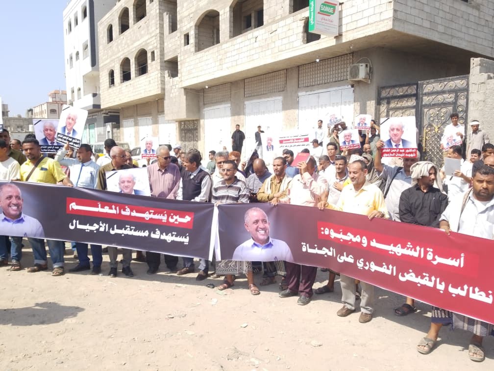 شهدت مديرية المنصورة في العاصمة المؤقتة عدن وقفة احتجاجية نفذها تربويون وأولياء أمور وناشطون، تنديدًا بجريمة اغتيال التربوي والقيادي عبدالرحمن الشاعر، رئيس مجلس إدارة مدارس النورس.