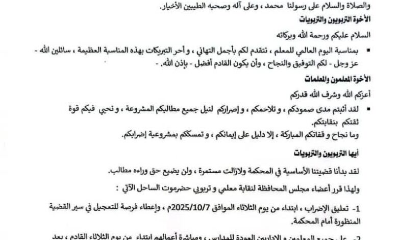 أعلنت نقابة معلمي وتربويي حضرموت الساحل، في بيان رسمي يوم أمس الأحد، تعليق الإضراب ابتداءً من يوم الثلاثاء القادم الموافق 7 أكتوبر 2025، وذلك لإتاحة الفرصة لاستكمال إجراءات القضية المنظورة أمام المحكمة المختصة، مع التأكيد على التمسك الكامل بالمطالب والحقوق المشروعة للمعلمين والتربويين.