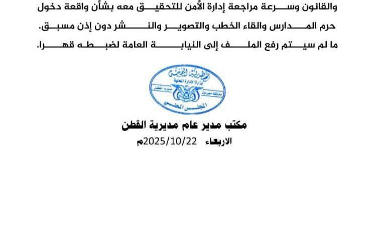 أصدر مكتب مدير عام مديرية القطن بيانًا رسميًا وجّه فيه إنذارًا إلى رئيس ما يُعرف بتيار التغيير والتحرير المدعو رياض عمر النهدي، على خلفية دخوله حرم إحدى المدارس وإلقائه خطبًا وتصويرها ونشرها دون الحصول على إذن مسبق من الجهات المختصة.