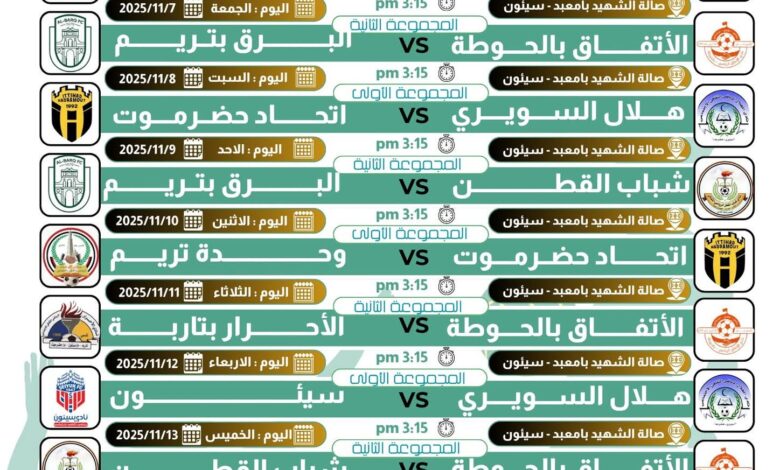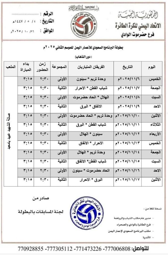 أقرّ فرع الاتحاد اليمني للكرة الطائرة بوادي حضرموت، جدول مباريات البطولة التنشيطية الثانية لأندية وادي وصحراء حضرموت للموسم 2025، والتي تنطلق منافساتها في السادس من نوفمبر القادم على صالة الشهيد علي عبيد باحمدين بمدينة سيئون.