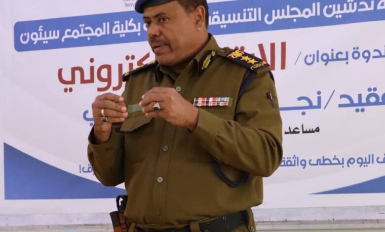 وجاءت المحاضرة في إطار التنسيق المشترك بين وزارة الداخلية ومؤسسات المجتمع المدني، وضمن فعاليات تدشين المجلس التنسيقي الطلابي بكلية المجتمع سيئون، في مسعى لنشر الوعي القانوني لدى الشباب والطلاب حول الجرائم الإلكترونية وطرق الوقاية منها.