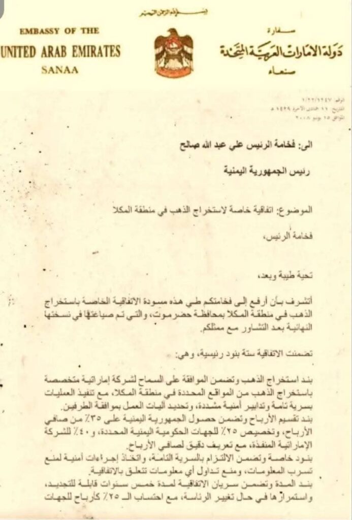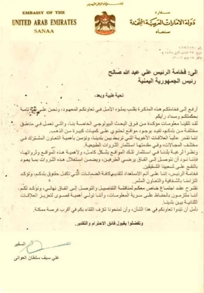 وبحسب ما ورد في الوثائق المتداولة، فقد وجّه سفير الإمارات لدى اليمن بتاريخ 15 يونيو 2007م مذكرة للرئيس الأسبق، أشار فيها إلى اكتشاف فرق إماراتية مواقع غنية بالذهب داخل الأراضي اليمنية، مع طلب عقد اجتماع سري لإبرام اتفاقات تتعلق بالاستثمار الكامل لهذه المواقع مع الحفاظ على سرية المعلومات المتصلة بها.