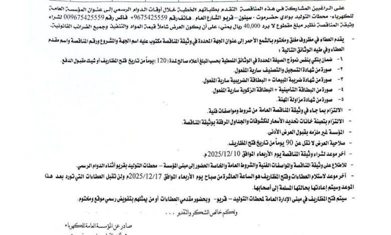 الكهرباء بوادي حضرموت تعلن عن إنزال مناقصة جديدة لخدمات النظافة لعام 2026