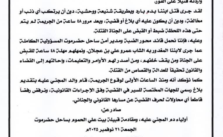 أصدر أولياء دم الشاب عمرو علي بن عجلان العليي ومقادمة قبيلة بيت علي الحموم بساحل حضرموت بيانا اتهموا فيه قوة عسكرية تابعة لمحور الضبة بالمسؤولية عن مقتل ابنهم في منطقة ضبضب بمدينة الشحر عند الساعة الواحدة بعد منتصف ليلة الأربعاء 19 نوفمبر 2025.