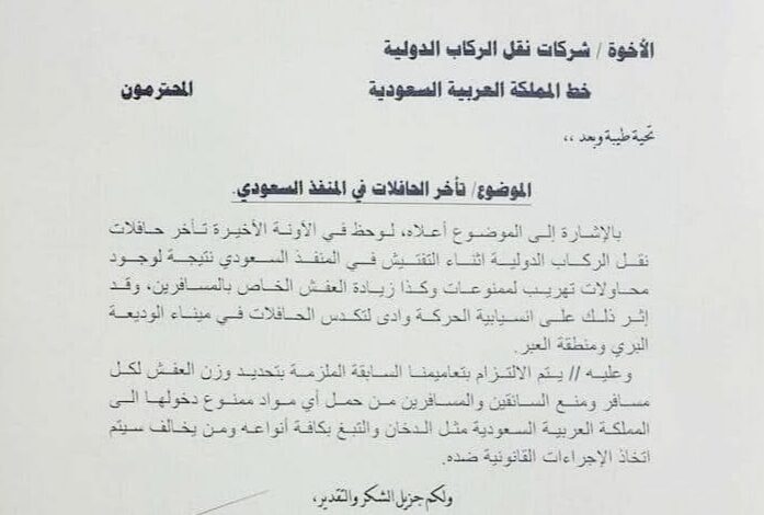 أصدرت الهيئة العامة لتنظيم شؤون النقل البري تعميماً لشركات نقل الركاب الدولية العاملة على خط المملكة العربية السعودية، بعد رصد حالات تأخير متكررة لحافلات المسافرين في المنفذ السعودي، وما تسبب به ذلك من ازدحام وإعاقة لانسيابية الحركة، وانعكاسه على وصول المسافرين إلى ميناء الوديعة البري ومنفذ العبر.