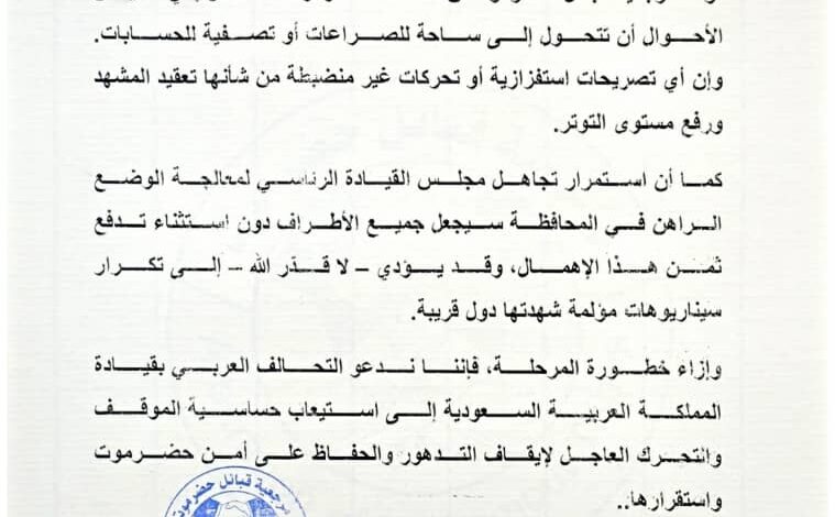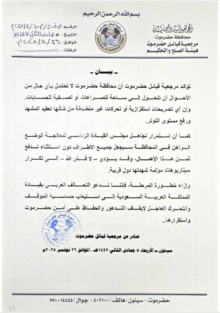 أعربت مرجعية قبائل حضرموت عن بالغ قلقها إزاء حالة الاحتقان المتصاعدة في المحافظة، محذّرة من أن أي انزلاق نحو صراعات داخلية أو تصفية حسابات سيجر حضرموت إلى وضع خطير لا يحتمل مزيداً من التوتر.