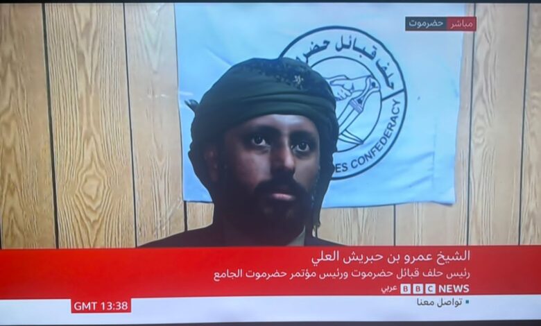 أدلى الشيخ عمرو بن حبريش العليي، رئيس حلف قبائل حضرموت، بتصريح لقناة BBC شدّد فيه على استعداد القبائل للدفاع عن أراضيها ورفض أي محاولات لفرض السيطرة على ثروات حضرموت أو مصادرة قرارها المحلي.