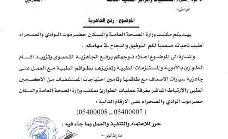أصدر مكتب وزارة الصحة العامة والسكان بوادي وصحراء حضرموت توجيهات رسمية إلى المستشفيات والمراكز الصحية برفع الجاهزية في أقسام الطوارئ، وتوفير الأدوية والمستلزمات الطبية الضرورية، وتعزيز جاهزية سيارات الإسعاف وطواقمها.