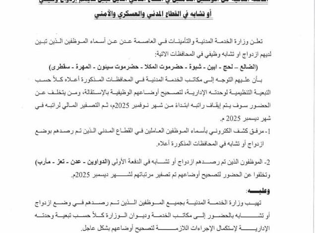وأوضحت الوزارة أنه تم إرفاق الكشف الإلكتروني بأسماء الموظفين العاملين في القطاع المدني ممن تم رصد ازدواجهم أو تشابه بياناتهم، مشيرة إلى أن الدفعة الثانية تشمل من لم يقوموا بإجراءات التصحيح خلال المرحلة الأولى (الدوارين – عدن – تعز – مأرب)، داعيةً إياهم للتوجّه لاستكمال التسويات.