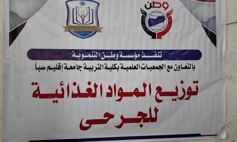 نفّذت مؤسسة وطن التنموية وبالشراكة مع الجمعيات العلمية في كلية التربية بجامعة إقليم سبأ، حملة توزيع للمواد الغذائية لصالح جرحى الجيش الوطني في مدينة مأرب، ضمن جهود إنسانية تهدف إلى دعم المصابين الذين قدّموا تضحيات كبيرة في سبيل الأمن والاستقرار.