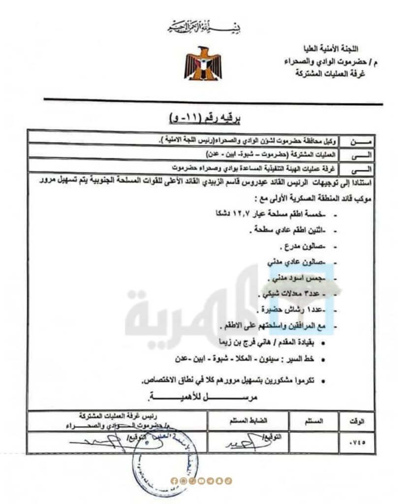 حصلت قناة المهرية على وثائق رسمية تُظهر توجيهات عليا صادرة عن قيادة المجلس الانتقالي الجنوبي، تقضي بتسهيل خروج قائد المنطقة العسكرية الأولى اللواء صالح الجعيملاني من وادي حضرموت عقب دخول قوات الانتقالي إلى الوادي.
