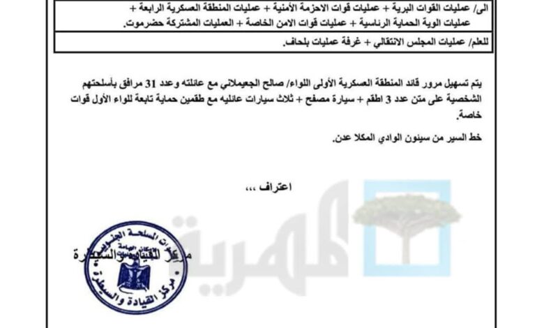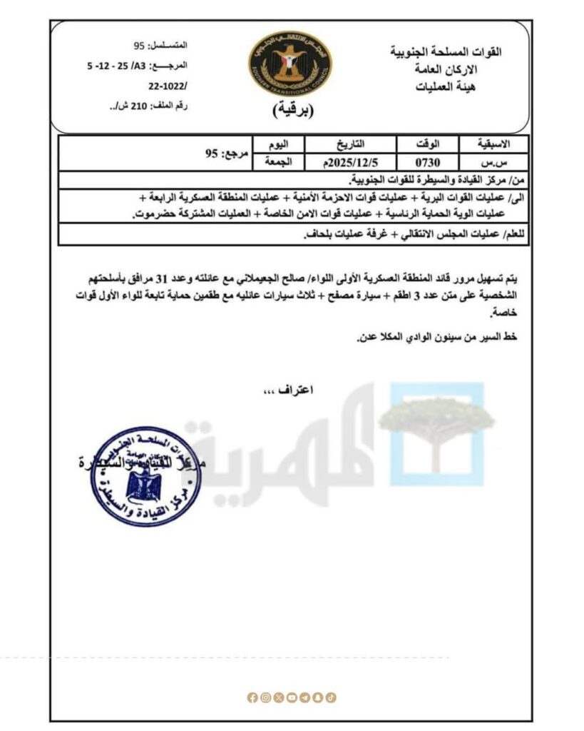 وتشير الوثائق إلى أن التوجيهات جاءت بشكل مباشر من رئيس المجلس الانتقالي عيدروس الزبيدي، في خطوة وُصفت بأنها جزء من “ترتيبات مسبقة” لتأمين مرور الجعيملاني.