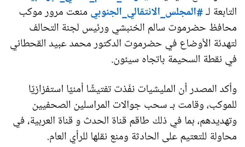 مصدر محلي: توتر أمني في حضرموت بعد اعتراض موكب رسمي أثناء مروره بنقطة السحيمة