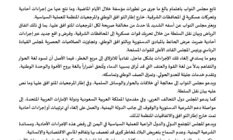 وجدد مجلس النواب دعوته لجميع القوى السياسية إلى رفض أي إجراءات أحادية، ومساندة الجهود الرامية إلى تجنيب البلاد مخاطر جديدة قد تزيد من معاناة المواطنين على المستويات الاقتصادية والإنسانية، مؤكداً ضرورة توحيد الجهود خلف مؤسسات الدولة المدنية والعسكرية لضمان أمن اليمن واستقراره.