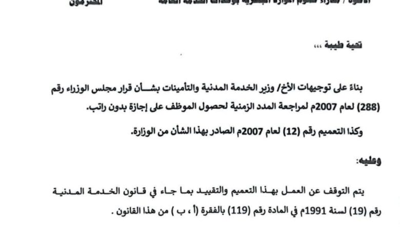 وزارة الخدمة المدنية توقف العمل بتعميم مراجعة مدد الإجازات بدون راتب