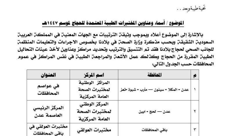 وبيّن التعميم أن المراكز المعتمدة تشمل مختبرات الصحة العامة المركزية في عواصم المحافظات، والمركز الرئيسي في العاصمة المؤقتة عدن، إضافة إلى مختبرات العولقي في بقية المحافظات.
