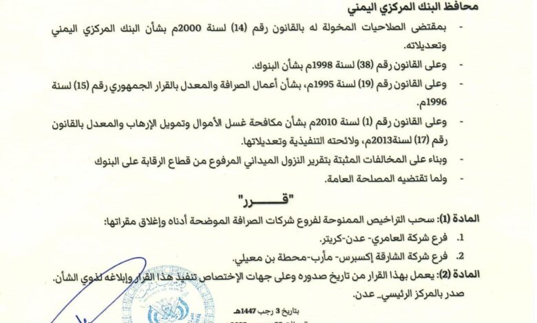 وجاء القرار استنادًا إلى الصلاحيات المخولة لمحافظ البنك المركزي اليمني وفق القوانين النافذة، وبناءً على المخالفات المثبتة بتقرير النزول الميداني المرفوع من قطاع الرقابة على البنوك، ولما تقتضيه المصلحة العامة.